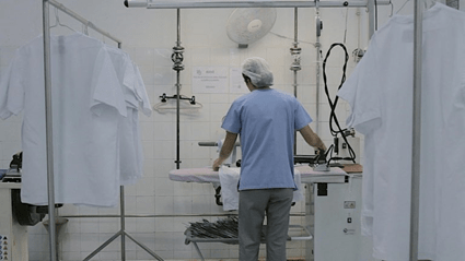 O filme começa. Era um silêncio mórbido, tanto das pessoas na plateia, quanto do próprio filme. A primeira cena trazia uma senhora, em um hospital, trabalhando. Ela manuseava um material cirúrgico. Separava-o e arrumava-o cuidadosamente. A cena me chamou muita atenção. Era uma pessoa que trabalhava em silêncio, solitária. E assim o filme se desenvolve, dentro de um hospital. Cada cena apresentava, cuidadosamente, um trabalhador daquele local. O filme trazia detalhes, trazia rostos, corpos, movimento, repetição, inovação. Eram trabalhos simples, mecânicos: mulheres separando a roupa, homens tirando a roupa da máquina de lavar, outros a passando, outros a dobrando, outros separando o material cirúrgico, outros o embalando, outros fazendo manutenção das máquinas e assim por diante.