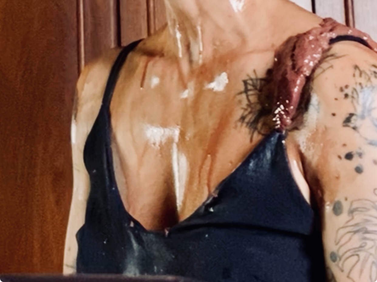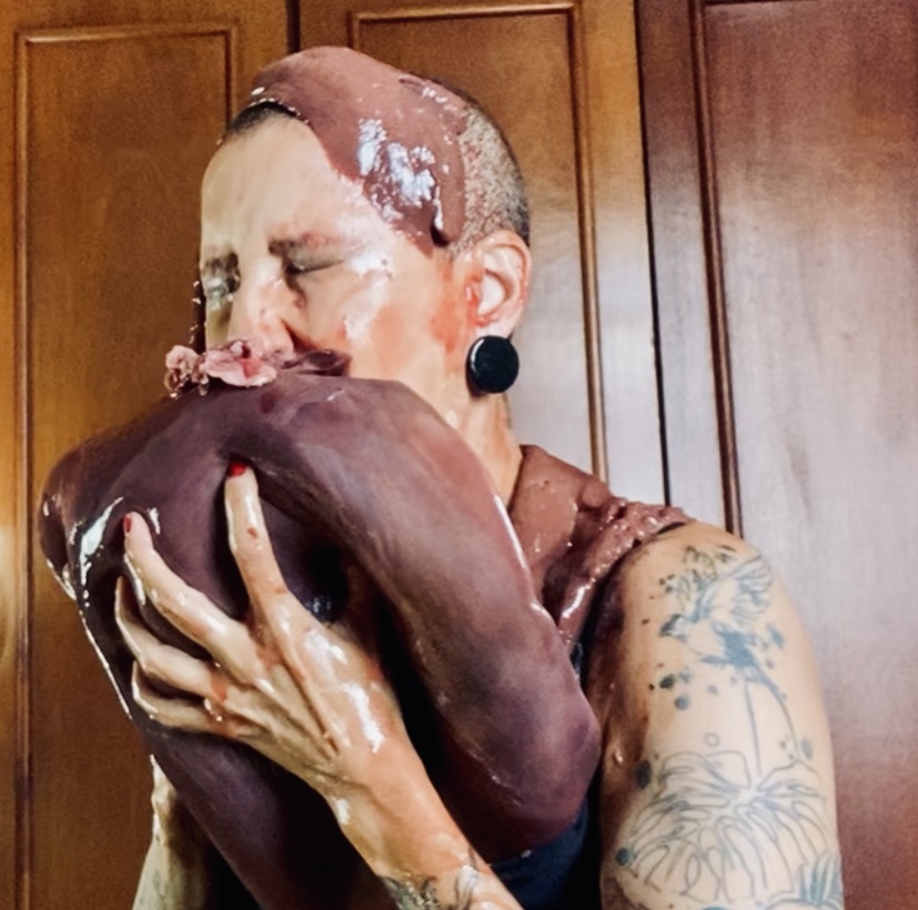 Com filtro é um trabalho de videoperformance no qual a artista faz uma crítica à construção e normatização da beleza nos dias atuais. No vídeo, ela, com a cabeça raspada, começa a se maquiar. Ao final da maquiagem, a necessidade e arrumar o cabelo surge enquanto demanda social. Assim, ela começa a utilizar fígado de boi na confecção de uma peruca. O processo se desenvolve até a impossibilidade do uso do fígado como cabelo. Ao final, o fígado engole sua cabeça.