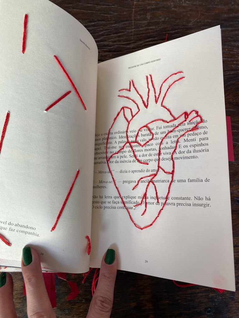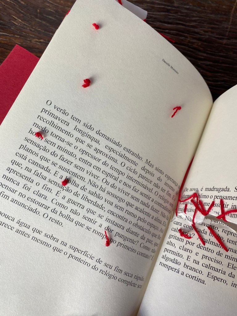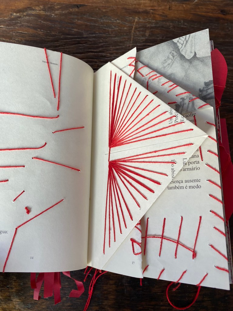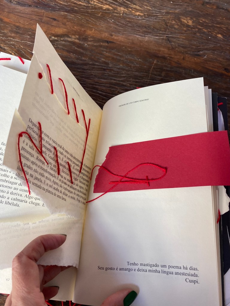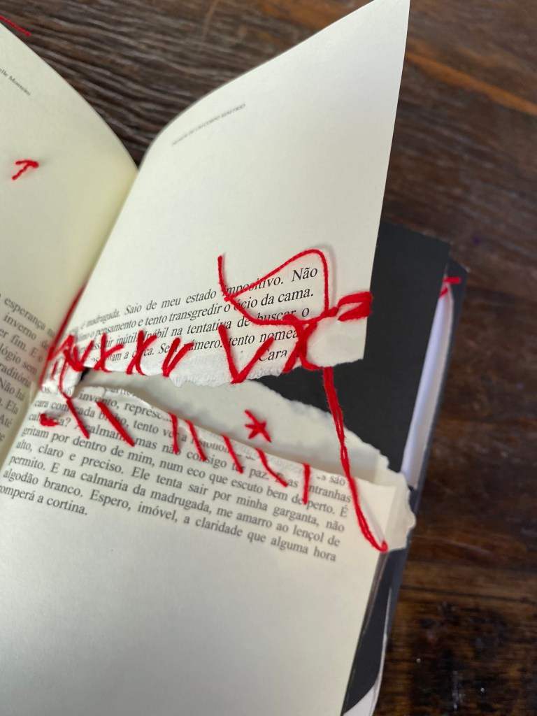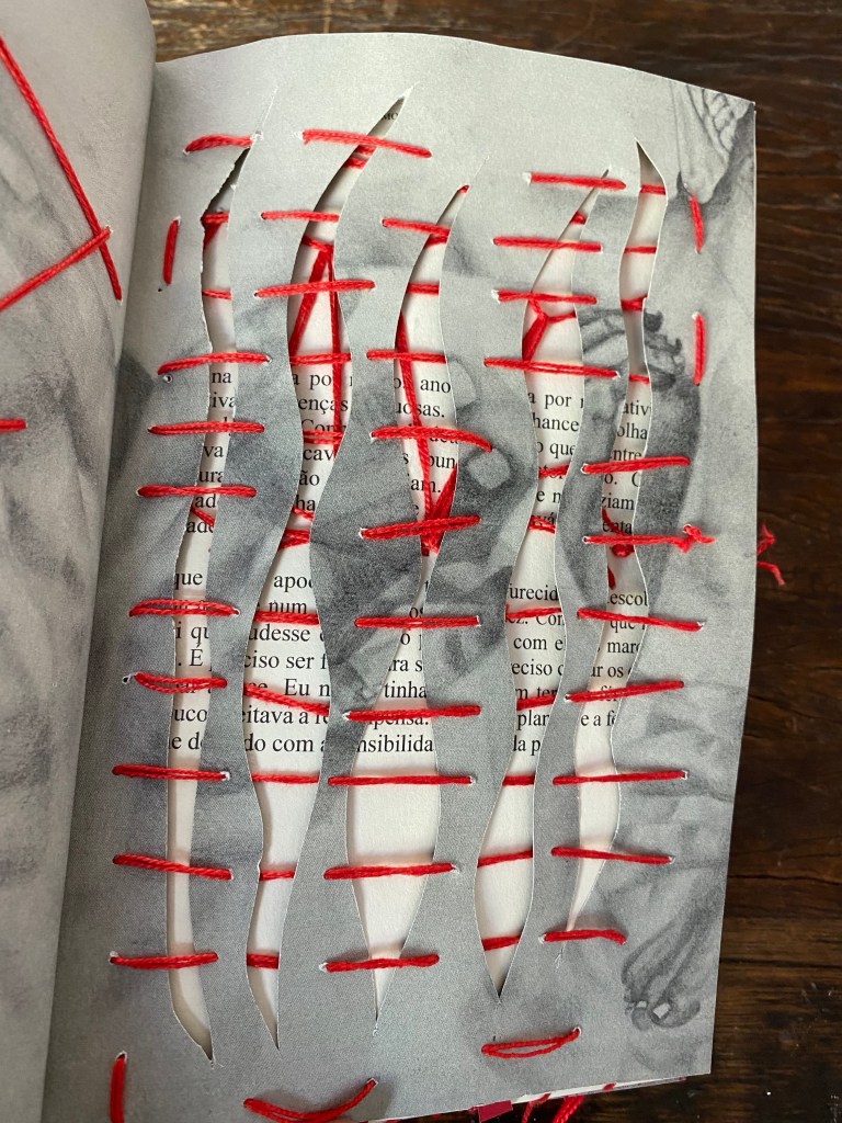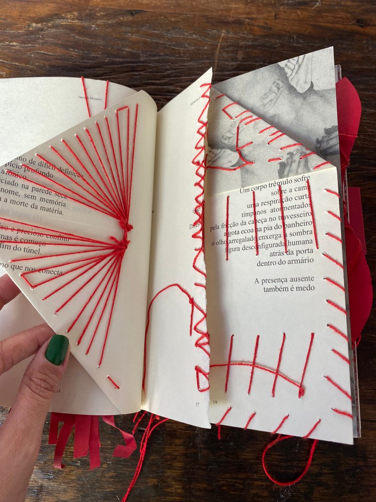A reescrita de um livro através do bordado que surge como corte, na medida em que possibilita a construção de novos significantes, faz aparecer e desaparecer a palavra, muda o sintoma, o sentido, o mesmo significante, outros significados. Assim, livro é tecido e a bordadeira torna-se, no ato de bordar, o centro do processo da palavra.