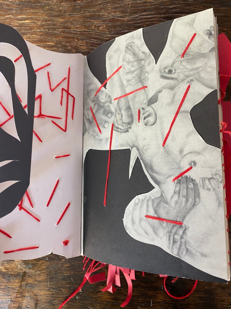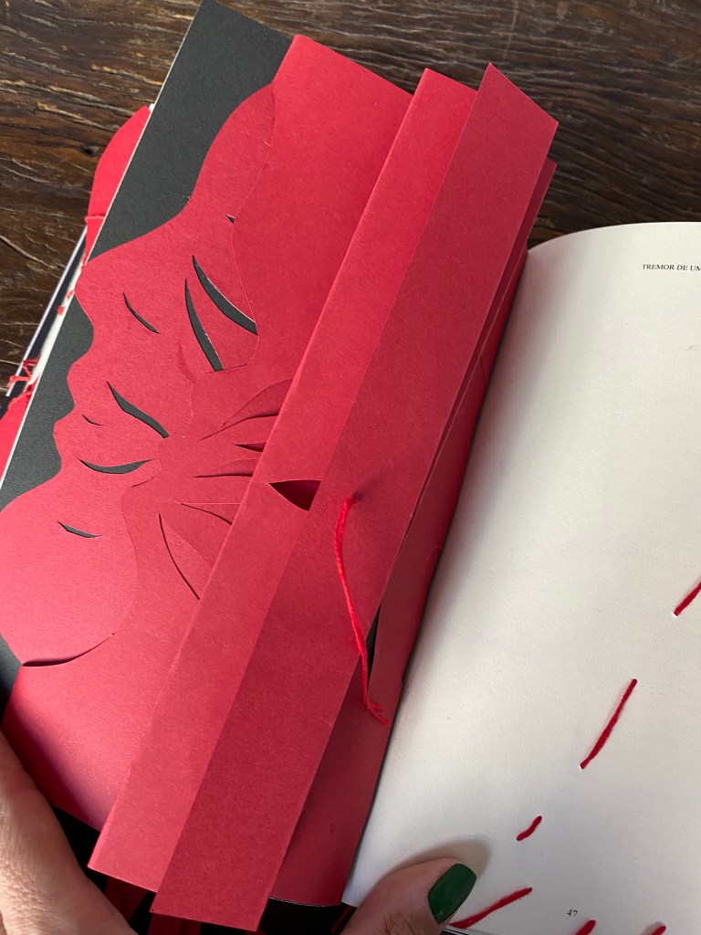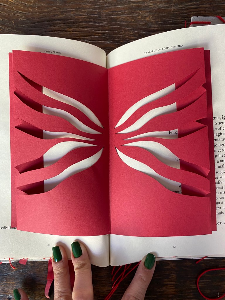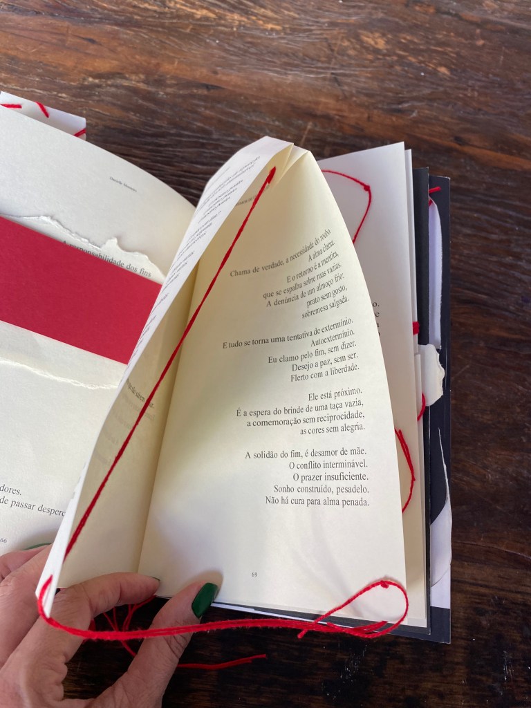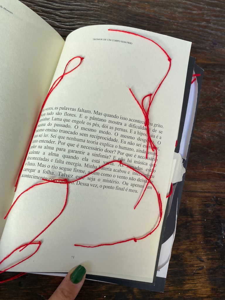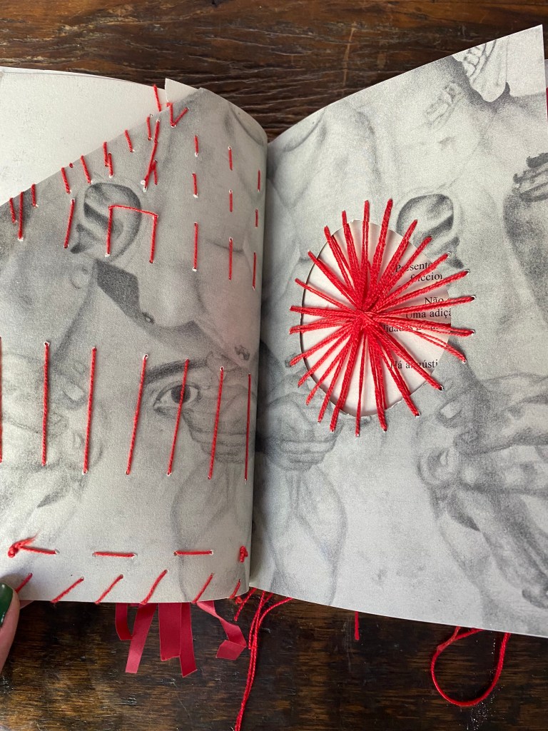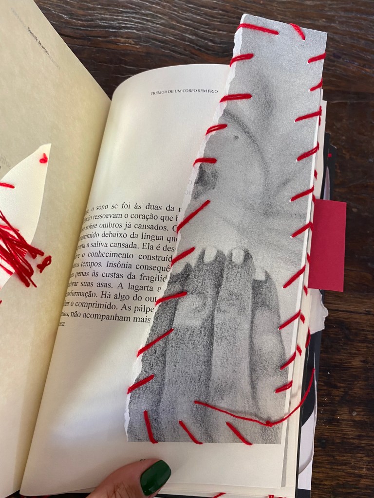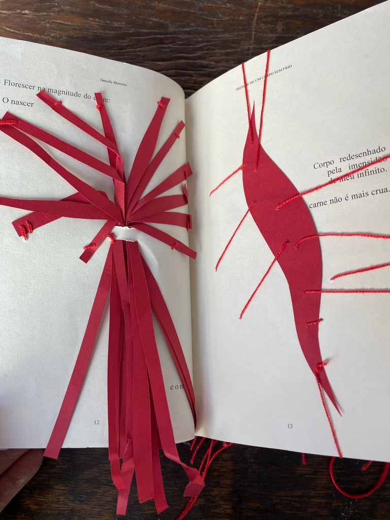 A reescrita de um livro através do bordado que surge como corte, na medida em que possibilita a construção de novos significantes, faz aparecer e desaparecer a palavra, muda o sintoma, o sentido, o mesmo significante, outros significados. Assim, livro é tecido e a bordadeira torna-se, no ato de bordar, o centro do processo da palavra.