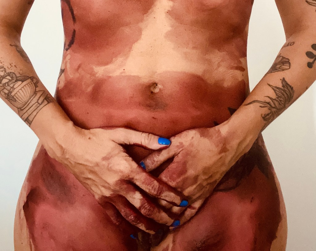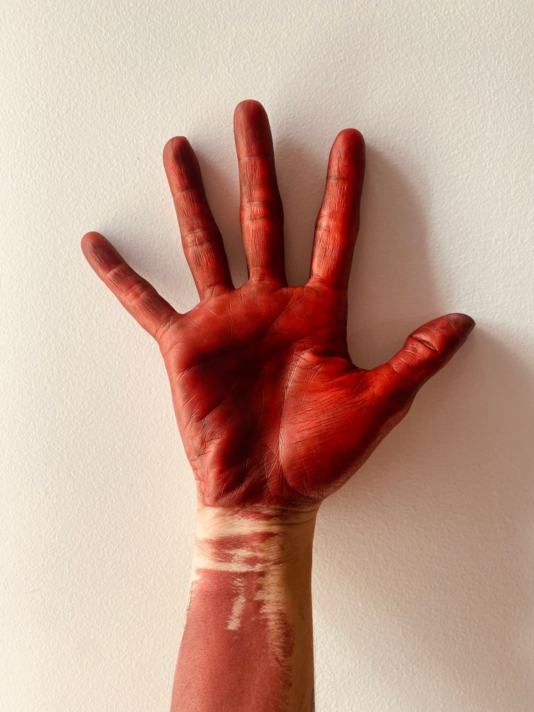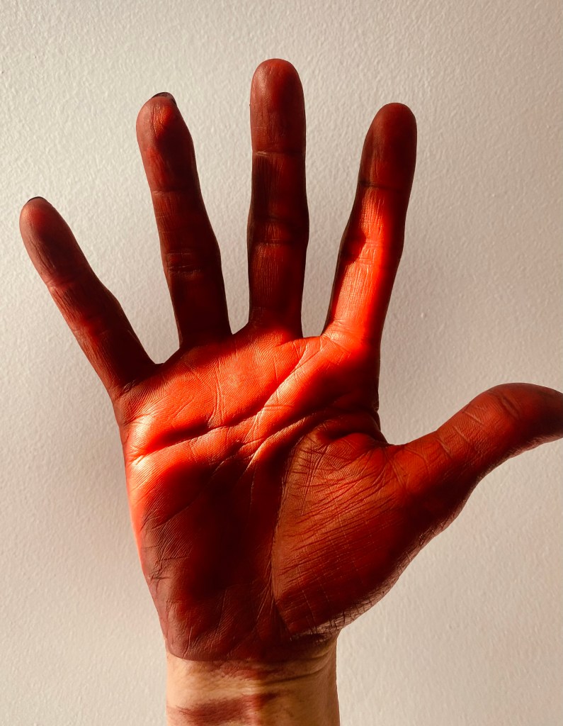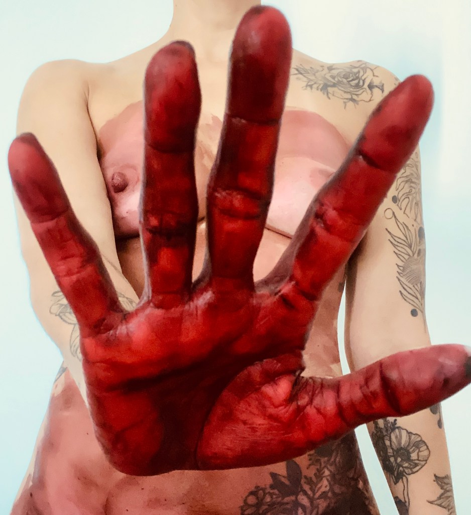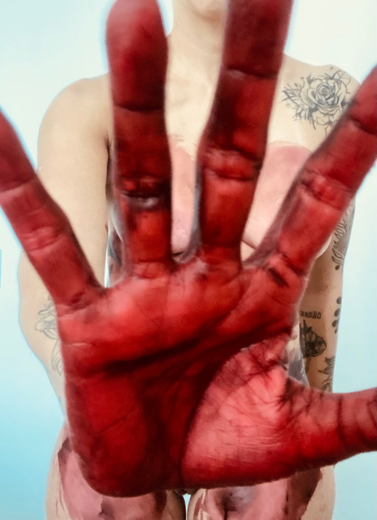 O ventre é vermelho. O seio carrega a digital vermelha. E a tentativa de se proteger impregna a mão de vermelho. Uma tinta feita de suor e lágrima. De silêncios e algumas cegueiras.